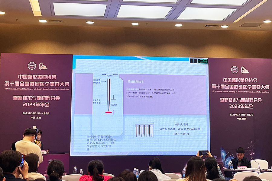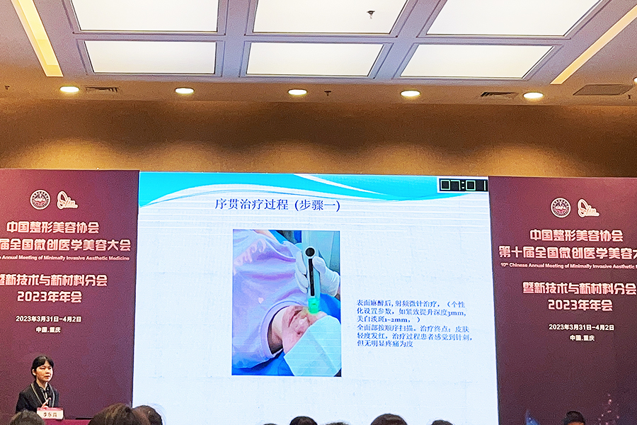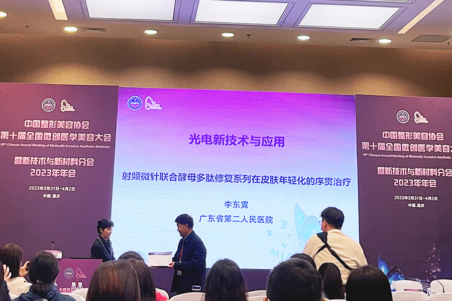 在新技術(shù)與新材料分會(huì)場(chǎng)中,廣東省第二人民醫(yī)院皮膚科主任李東霓教授的專題《射頻微針聯(lián)合酵母多肽修復(fù)系列在皮膚年輕化的序貫治療》提到了中科科理的射頻微針。