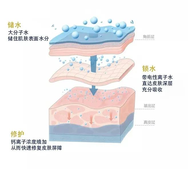 水離子發(fā)生器將普通水變成帶電性的離子水,通過(guò)改變細(xì)胞膜的斷位分布來(lái)打開(kāi)水離子通道,快速加強(qiáng)水對(duì)皮膚的滲透性,使補(bǔ)水直達(dá)皮膚深層。