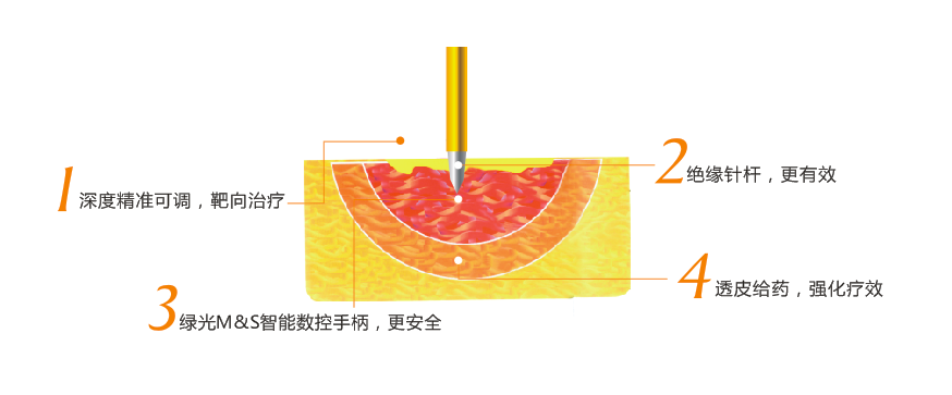 根據(jù)針對問題與治療部位,調(diào)節(jié)微針穿透深度和射頻能量,綠光M&S智能數(shù)控手柄操控下,數(shù)十根絕緣微針同時快速穿透表皮,微針針尖發(fā)射射頻能量,隨即快速退出,如此循環(huán)往復(fù),直至治療完畢